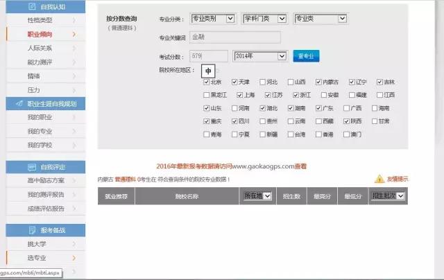 例如“呼市一中學(xué)生發(fā)展支援系統(tǒng)平臺(tái)”就是呼和浩特市第一中學(xué)為本校學(xué)生提供的一個(gè)生涯規(guī)劃系統(tǒng)平臺(tái),這里可以查閱全國(guó)各院校在內(nèi)蒙招生的精確數(shù)據(jù),為學(xué)生提供了一個(gè)集自我認(rèn)知測(cè)評(píng)、高考報(bào)考數(shù)據(jù)查詢、高中勵(lì)志方案制作、成績(jī)走勢(shì)分析、高校專業(yè)和社會(huì)行業(yè)職業(yè)查詢?yōu)橐惑w的生涯規(guī)劃輔助系統(tǒng)平臺(tái)。