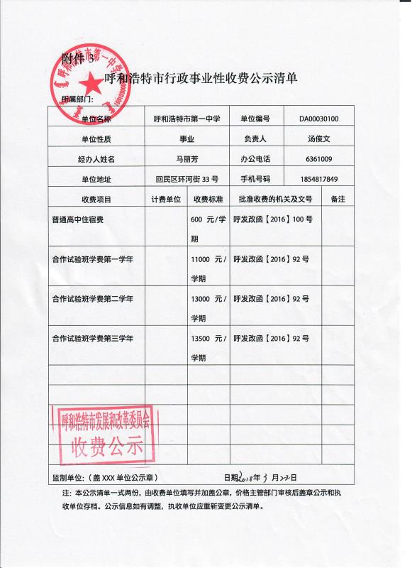 2018年呼市行政事業(yè)性收費(fèi)公示清單