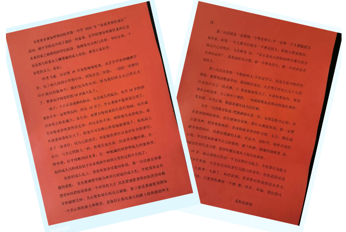 •        家長代表魏福龍作為家長代表,飽含著對兒女深切的期望,朗讀了他寫給孩子的一封家書。這封家書中表達了父母對孩子做人的要求,也表達了父母對孩子最真摯的愛。