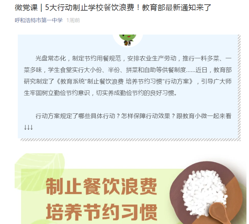 約低碳是現(xiàn)代文明生活新風(fēng)尚。呼市一中黨委第一時間傳達各級黨委的指示精神,成立工作組,按照呼市教育局《開展厲行節(jié)約、杜絕餐飲浪費專項工作實施方案》的要求,制定《呼市一中關(guān)于開展制止餐飲浪費、培養(yǎng)節(jié)約習(xí)慣行動實施方案》,利用校園廣播、標語、掛圖、公眾號“微黨課”等媒介,多種形式宣傳制止餐飲浪費,讓節(jié)約教育在學(xué)校隨處可見,營造濃厚氛圍,提高全校師生對餐飲浪費的政治自覺,在全校倡導(dǎo)健康文明節(jié)約的餐飲消費方式。