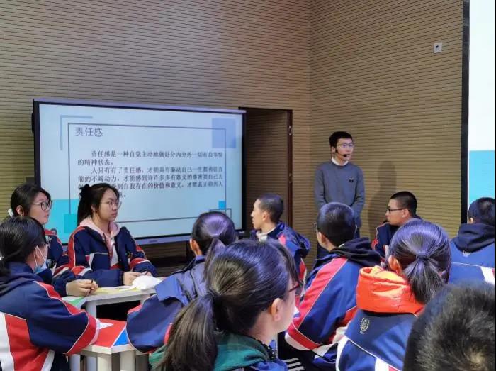 孟慶宇老師以一則社會新聞視頻導(dǎo)入,引導(dǎo)學(xué)生們思考:如果上學(xué)路上,遇到了紅燈,為了按時到班,是否要闖紅燈?生活中處處有責(zé)任,我們都是責(zé)任的踐行者,當(dāng)代青年,我們更要勇?lián)鐣?zé)任。緊接著,孟老師又讓同學(xué)們寫下并分享:你擔(dān)負(fù)過哪些社會責(zé)任?同學(xué)們經(jīng)過了詳細(xì)認(rèn)真的思考,踴躍發(fā)言,每個小組都分享了本組承擔(dān)過的社會責(zé)任,同學(xué)們以小事為抓手,談到了日常學(xué)習(xí)生活的方方面面中應(yīng)該承擔(dān)的責(zé)任,也提及了從社會層面、國家層面應(yīng)當(dāng)積極實踐的責(zé)任。最后,孟老師以第三個思考題,讓大家寫下:未來,我想成為一個________的人,我想要對(自己/家庭/社會)承擔(dān)起________責(zé)任,為此我現(xiàn)在應(yīng)該_________。孟老師以人民日報的視頻——全民抗疫的點滴事跡為結(jié)語,鼓勵學(xué)生們積極踐行社會責(zé)任,點滴之間,從小事做起,從自身做起,實現(xiàn)自我價值。