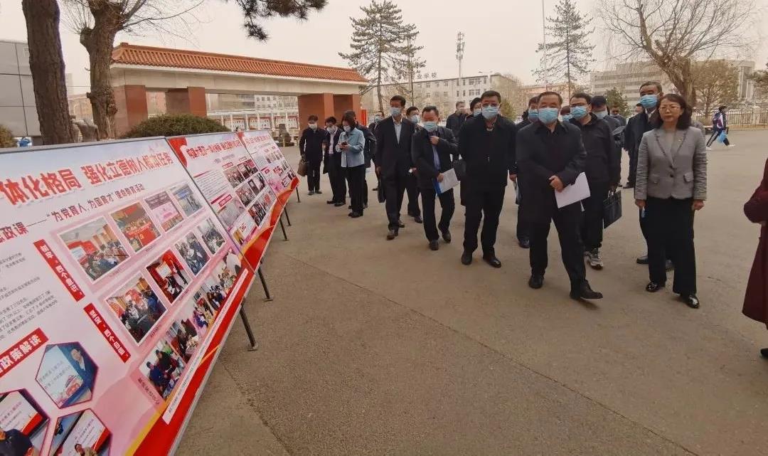與會代表通過展板了解學校開展思政課、鑄牢中華民族共同體意識教育、為黨育人為國育才活動及開展學黨史教育活動情況,系列展板以“構建大思政一體化格局 強化立德樹人根本任務”為主題,展示了學校落實立德樹人根本任務,守好學校意識形態(tài)前沿陣地,發(fā)揮五育并舉的優(yōu)勢,將培育和踐行社會主義核心價值觀落細落實。同時以思政課為統(tǒng)領,以思政教師隊伍建設為核心,建立了黨委統(tǒng)一領導,黨政齊抓共管,各部門各負其責,全校協(xié)同配合的思政課工作格局。