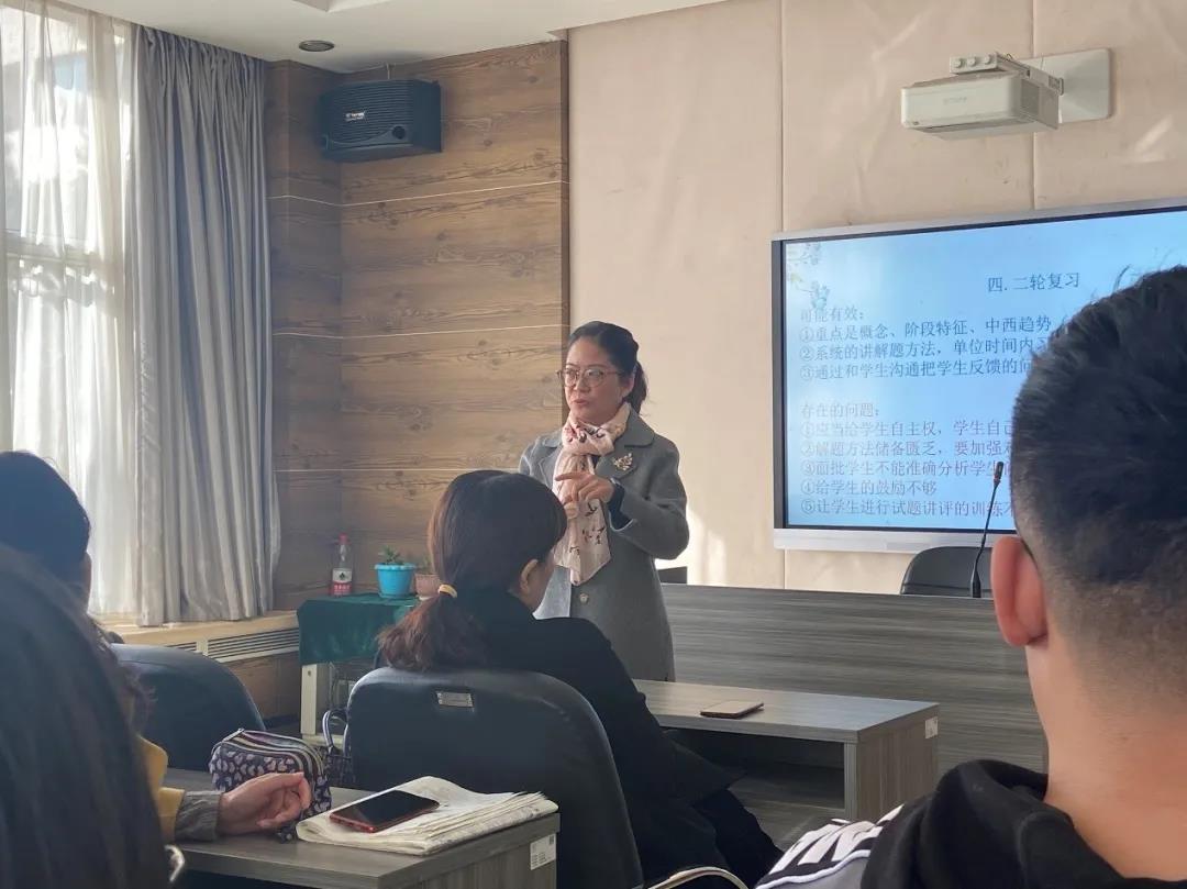賀怡老師從文理分科前、深度學(xué)習(xí)、一輪復(fù)習(xí)、二輪復(fù)習(xí)等不同階段提供了自身的工作與學(xué)習(xí)經(jīng)驗(yàn)。賀怡老師在文理分科之前教學(xué)方面注重趣味教學(xué),吸引學(xué)生學(xué)習(xí)歷史的興趣;在深度學(xué)習(xí)階段盡可能讓學(xué)生形成一套知識(shí)細(xì)致完整的筆記,注重基礎(chǔ)知識(shí)的考察;在一輪復(fù)習(xí)階段注重將點(diǎn)與點(diǎn)、事與事之間的聯(lián)系再強(qiáng)化,重視史料研讀,適當(dāng)滲透新教材;在二輪復(fù)習(xí)階段通過“保干穩(wěn)枝”的方式強(qiáng)化學(xué)生關(guān)于基礎(chǔ)概念、中西趨勢(shì)的認(rèn)知。賀怡老師的分享使得組內(nèi)青年教師受益匪淺。