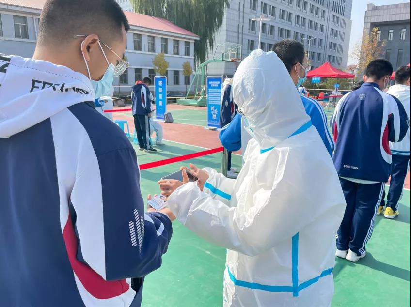 檢測(cè)過(guò)程中,各小組密切配合。核酸檢測(cè)工作以10人為一組,同學(xué)們排著整齊的隊(duì)伍,自覺(jué)佩戴口罩,間隔出1米以上的安全距離,在學(xué)生處老師的指引下,安靜有序地進(jìn)行核酸檢測(cè)。