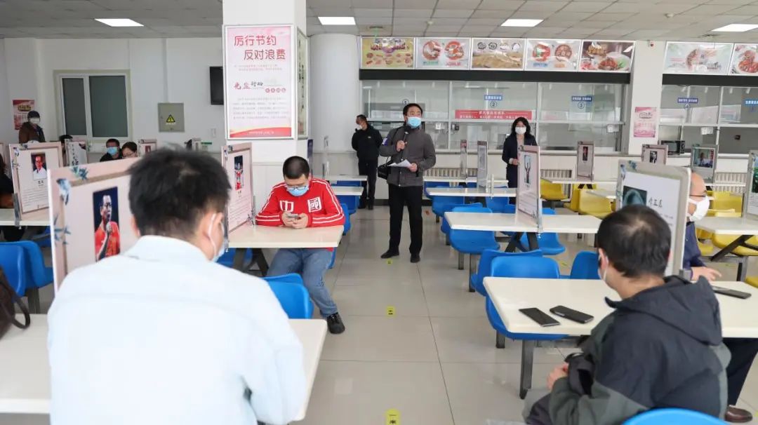 食堂就餐要保持就餐距離,一桌兩人,錯(cuò)位就坐。