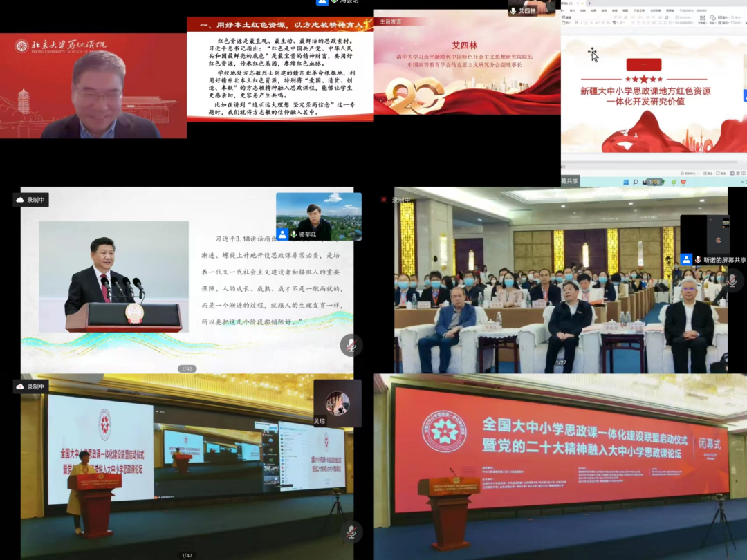 為深入貫徹習(xí)近平總書記關(guān)于“要把統(tǒng)籌推進(jìn)大中小學(xué)思政課一體化建設(shè)作為一項(xiàng)重要工程”的重要指示精神,認(rèn)真落實(shí)中辦、國(guó)辦印發(fā)的《關(guān)于深化新時(shí)代學(xué)校思想政治理論課改革創(chuàng)新的若干意見》等相關(guān)文件精神,協(xié)同推進(jìn)全國(guó)大中小學(xué)思政課一體化建設(shè),更好發(fā)揮思政課落實(shí)立德樹人根本任務(wù)的關(guān)鍵課程作用。2022年10月29日,由江西省委教育工委、省教育廳指導(dǎo),北京師范大學(xué)、哈爾濱工業(yè)大學(xué)、石河子大學(xué)、江西師范大學(xué)、山東師范大學(xué)、常州大學(xué)、汕頭大學(xué)、喀什大學(xué)、景德鎮(zhèn)陶瓷大學(xué)主辦,景德鎮(zhèn)市教育體育局及9所高校馬克思主義學(xué)院承辦的全國(guó)大中小學(xué)思政課一體化建設(shè)聯(lián)盟啟動(dòng)儀式暨黨的二十大精神融入大中小學(xué)思政課論壇通過線上線下相結(jié)合的方式舉行。教育系統(tǒng)有關(guān)領(lǐng)導(dǎo)、全國(guó)知名專家學(xué)者和優(yōu)秀思政課教師參會(huì),共同協(xié)力推進(jìn)全國(guó)大中小學(xué)思政課一體化建設(shè)的理論與實(shí)踐。呼和浩特市第一中學(xué)黨委書記、校長(zhǎng)馬波應(yīng)邀參加此次論壇,做了《守望相助, 逐夢(mèng)共遠(yuǎn)——大中小學(xué)思政課一體化高質(zhì)量發(fā)展的實(shí)踐與思考》的主題發(fā)言,呼和浩特市第一中學(xué)政治教研組全組教師線上參加了此次論壇活動(dòng)。