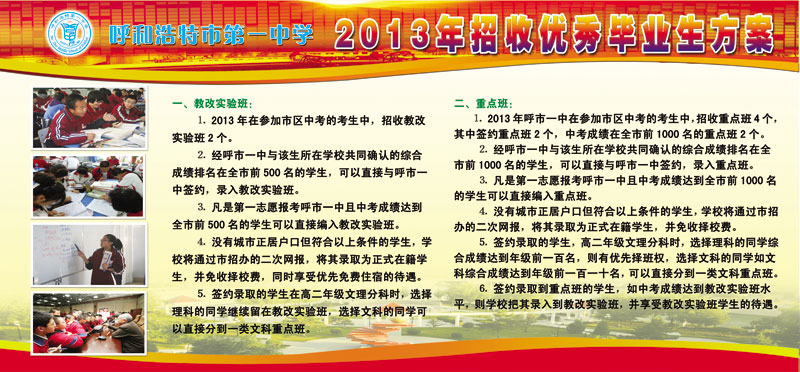 ⒉ 經(jīng)呼市一中與該生所在學(xué)校共同確認(rèn)的綜合成績排名在全市前500名的學(xué)生,可以直接與呼市一中簽約,錄入教改實驗班。