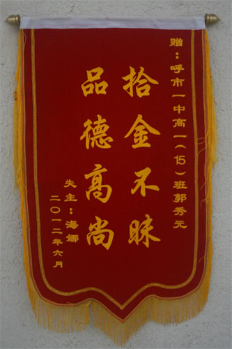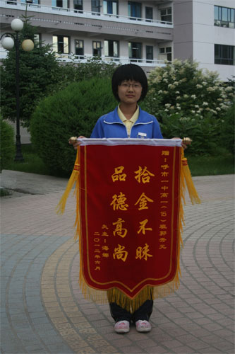拾金不昧是中華民族的傳統(tǒng)美德,也是一個人良好道德風尚和崇高社會責任感的具體體現(xiàn)。2012年5月25日高一(15)班郭秀元同學在友誼小區(qū)撿到一個錢包,內有2000多元現(xiàn)金以及醫(yī)??ǖ任锲?,她在原地等待一小時,最后從錢包里找到電話本,可是失主關機,第二天繼續(xù)聯(lián)系,終于打了許多電話后聯(lián)系上失主。把錢包如數(shù)還給失主,并婉言拒絕了失主的現(xiàn)金感謝。直至開學,失主向學校送來了感謝信和錦旗,我校師生才知道郭秀元同學的先進事跡。