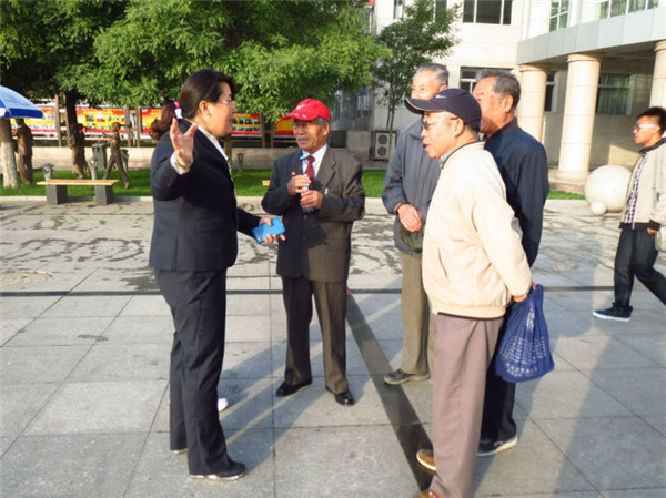 圖為我校楊老師正引領(lǐng)老校友參觀學(xué)校