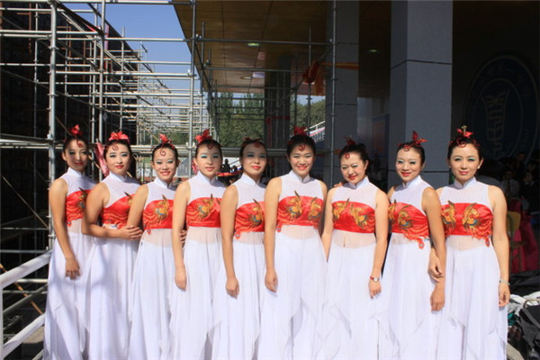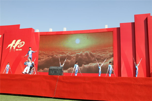 圖為李琳,《千手觀音》演員們的手語(yǔ)指導(dǎo)老師,攜千手觀音全體演員來(lái)為我校校慶慶典助威