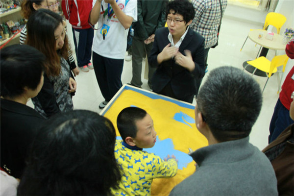 圖為我校心理沙盤室,賈老師正為大家熱情講解