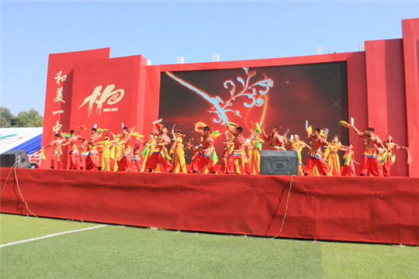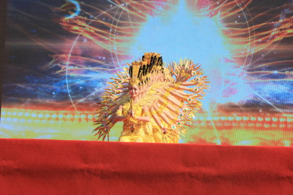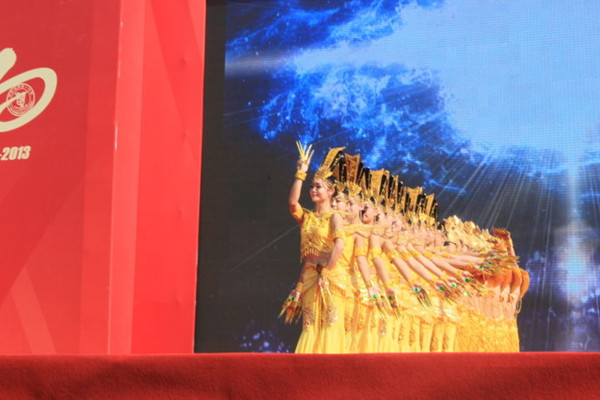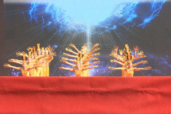圖為校慶慶典文藝匯演中千手觀音的演出實(shí)況