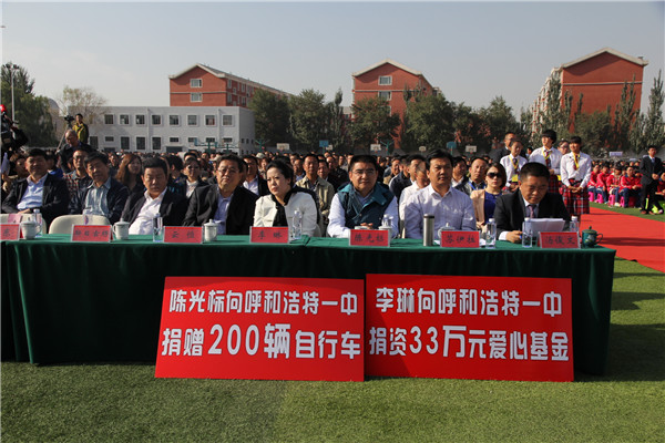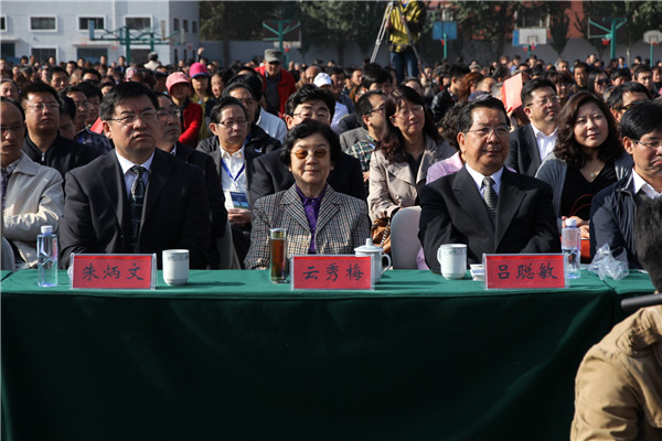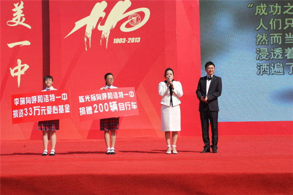 首先,由呼和浩特市教育局副局長(zhǎng)、呼市一中黨總支書記余澤強(qiáng)主持開幕儀式,致開幕詞;大會(huì)第一項(xiàng):全體起立,奏唱國(guó)歌、校歌;大會(huì)第二項(xiàng):介紹出席活動(dòng)的主要領(lǐng)導(dǎo)和嘉賓,出席今天活動(dòng)的領(lǐng)導(dǎo)和嘉賓有:教育部整體改革司副司長(zhǎng)彭斌柏,中國(guó)教育報(bào)刊社副社長(zhǎng)、中國(guó)教師報(bào)總編雷振海,國(guó)家副總督學(xué)、中國(guó)教育學(xué)會(huì)原常務(wù)副會(huì)長(zhǎng)郭振有,中國(guó)教師報(bào)總編室主任李炳亭,人大外事委員會(huì)原副主任委員呂聰敏,自治區(qū)人大原副主任云秀梅,自治區(qū)原人大副主任柳秀,自治區(qū)教育廳廳長(zhǎng)候元,自治區(qū)紅十字會(huì)會(huì)長(zhǎng)劉菊茹,自治區(qū)教育廳黨組成員巡視員董方成,自治區(qū)教育廳副廳長(zhǎng)姚云峰,自治區(qū)教育學(xué)會(huì)會(huì)長(zhǎng)秦政奇,內(nèi)蒙古大學(xué)黨委書記朱炳文,內(nèi)蒙古師范大學(xué)副校長(zhǎng)張海峰,內(nèi)蒙古工業(yè)大學(xué)副校長(zhǎng)峻峰,呼市市委副書記、政法委書記趙江濤,呼市人大副主任李博宏,呼市人大副主任付東海,呼和浩特市副市長(zhǎng)王恒俊,呼市政協(xié)副主席白云,呼市政府副秘書長(zhǎng)斯日古楞,呼市教育局黨委書記云恒,呼市教育局局長(zhǎng)云春生,參加活動(dòng)的還有曾在一中工作、學(xué)習(xí)過的老領(lǐng)導(dǎo)、老教師、老校友,自治區(qū)、呼市部分高校,旗縣區(qū)、委辦局的負(fù)責(zé)同志,兄弟學(xué)校的領(lǐng)導(dǎo)及新浪等新聞媒體的朋友。大會(huì)第三項(xiàng):由自治區(qū)教育廳副廳長(zhǎng)姚云峰致辭;大會(huì)第四項(xiàng):由校友代表原全國(guó)人大外事委員會(huì)副主任委員呂聰敏校友講話;大會(huì)第五項(xiàng):由內(nèi)蒙古教育出版社集團(tuán)領(lǐng)導(dǎo)講話;大會(huì)第六項(xiàng):由中國(guó)教育報(bào)刊社副社長(zhǎng)、中國(guó)教師報(bào)總編輯雷振海講話,并同呼市教育局局長(zhǎng)云春生為我校頒發(fā)綠色高中共同體學(xué)校銅牌;大會(huì)第七項(xiàng):由呼和浩特市副市長(zhǎng)王恒俊講話;大會(huì)第八項(xiàng):由湯俊文校長(zhǎng)做主題報(bào)告;大會(huì)第九項(xiàng):呼市一中師生匯報(bào)演出;期間還舉行了陳光標(biāo)和李琳向我校的捐贈(zèng)儀式?,F(xiàn)場(chǎng)氣氛熱烈,體現(xiàn)了我校繼往開來(lái),延續(xù)百年的輝煌。