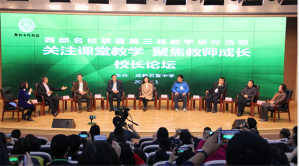 在研討會(huì)的最后,西部名校聯(lián)盟八大名校校長(zhǎng)針對(duì)會(huì)議主題“關(guān)注課堂教學(xué),聚焦教師成長(zhǎng)”進(jìn)行了深度研討。廣西南寧市第二中學(xué)黃幼巖校長(zhǎng)對(duì)教師成長(zhǎng)做了總結(jié)性概括,黃校長(zhǎng)認(rèn)為,教師成長(zhǎng)無(wú)外乎從合格教師到成熟教師,最后到魅力教師。魅力教師是指“師儀端正、師德崇高、師學(xué)寬厚、師藝精湛”。教師的蛻變,不僅要外在的激勵(lì),更要喚醒自身,學(xué)校給予老師舞臺(tái),他們自會(huì)成就自己,同時(shí)成就別人,成就國(guó)家的未來(lái)。青海西寧市第五高級(jí)中學(xué)校長(zhǎng)關(guān)金海也認(rèn)為,要將發(fā)展機(jī)會(huì)給予老師,尤其是青年教師,為此學(xué)校成立了青年教師自主發(fā)展聯(lián)盟,由老師主導(dǎo),學(xué)校提供支持。我校湯俊文校長(zhǎng)在研討會(huì)上就學(xué)校的源起、學(xué)校的現(xiàn)實(shí)使命以及學(xué)校的未來(lái)發(fā)展做了簡(jiǎn)潔、清晰而精彩的闡述。