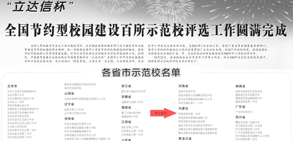 熱烈祝賀全國節(jié)約型校園建設(shè)百所示范校評選工作圓滿完成,在此次評選活動中,內(nèi)蒙古自治區(qū)共有六所學(xué)校勝出,其中呼和浩特市第一中學(xué)榜上有名!