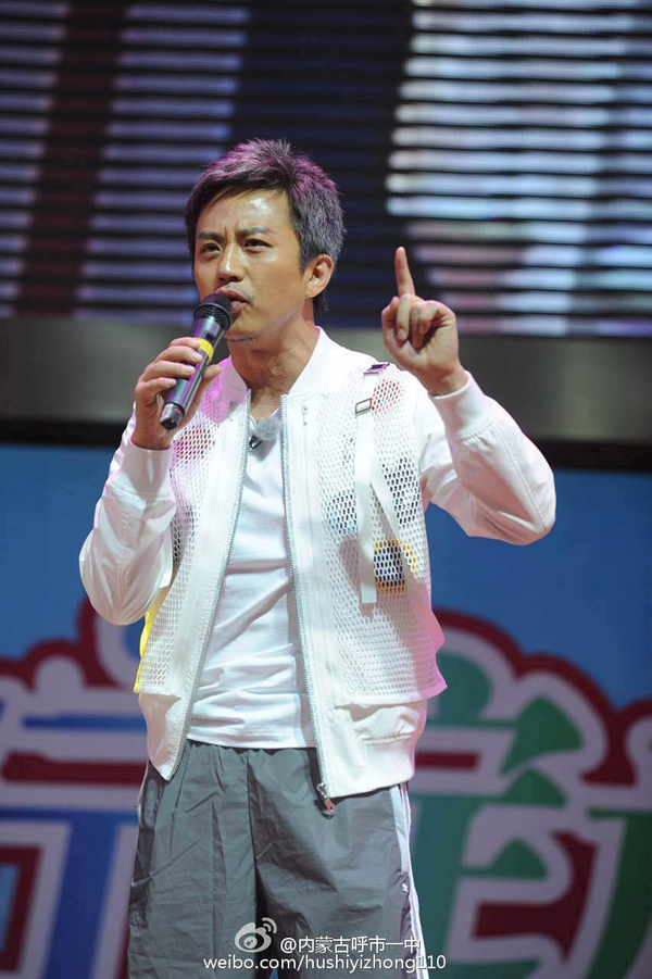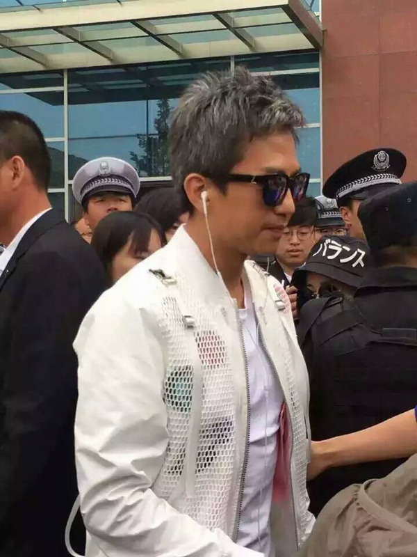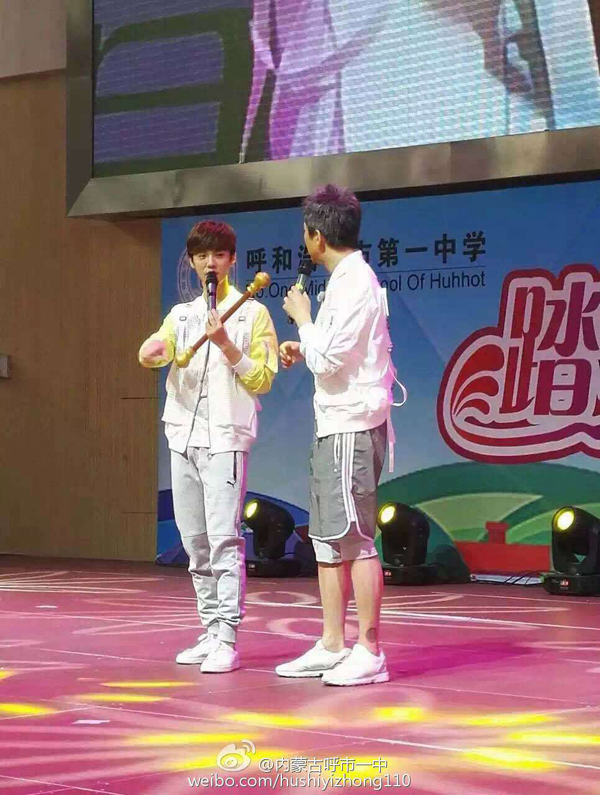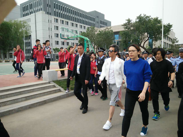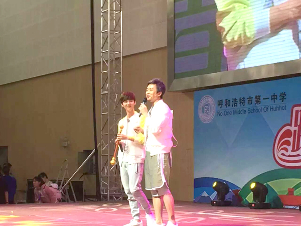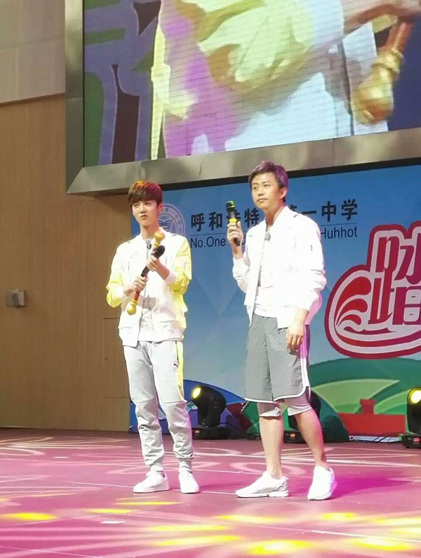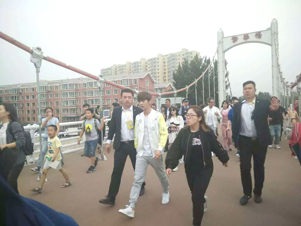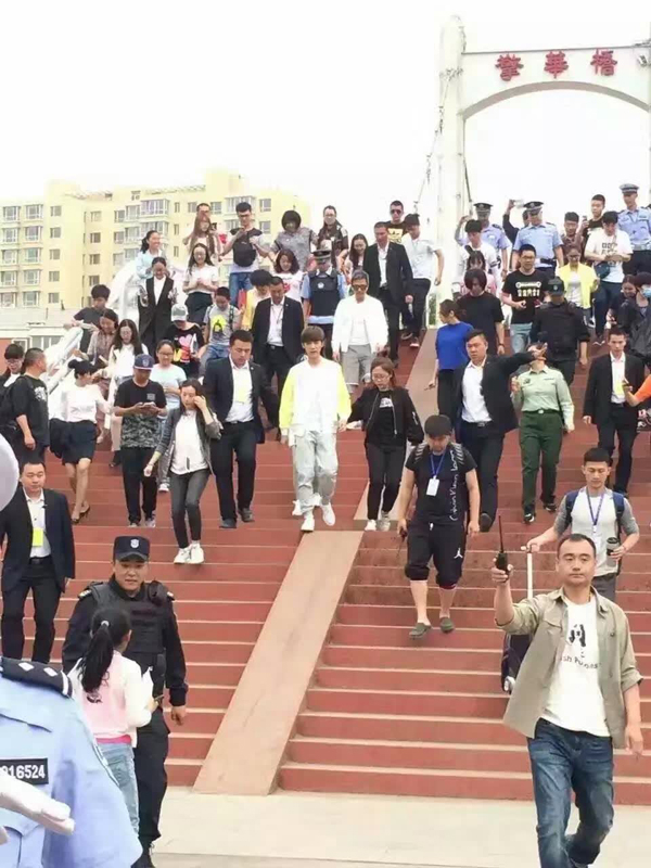 跑男鄧超、鹿晗走上擎華橋,向我校畢業(yè)典禮的現(xiàn)場體育館健步走來