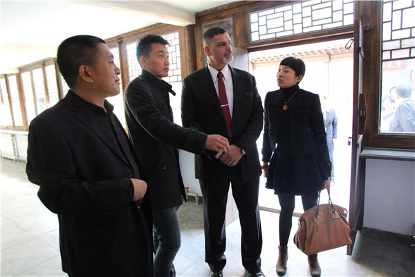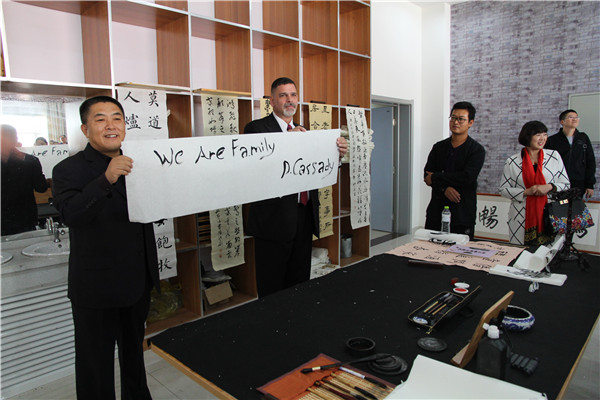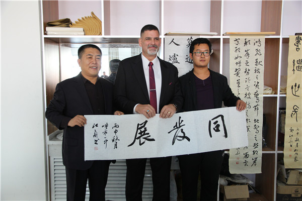 觀摩我校的校本課程——書法課,我校的書法教師為美國朋友現(xiàn)場書寫“同發(fā)展”書法作品,贈送給美方代表,