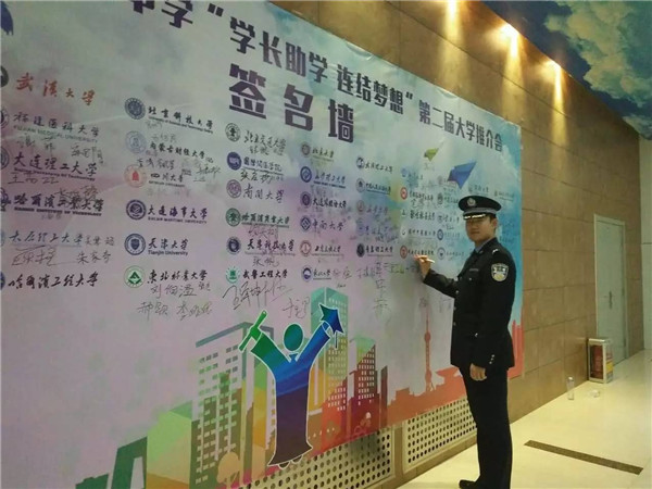 活動開始前,同學們紛紛在簽名墻上簽名,在大學?;諌η埃浿谱8<恼Z,送給即將高考的高三學弟學妹。