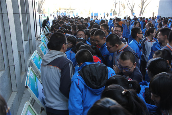 我校展出的49門豐富多彩的校本課程,學(xué)生們興高采烈地認(rèn)真瀏覽、相互討論、詳細(xì)記錄、思考自己要選修的校本課程。